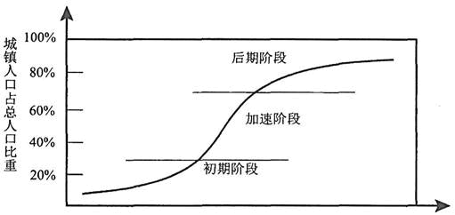【解析】城镇化发展阶段的划分一般用城镇化水平来衡量。城镇化水平也称为“城镇化率”,可用一定地域内城市人口占总人口比例来表示。1975年,美国城市学者诺瑟姆发现并提出了“诺瑟姆曲线”。诺瑟姆将一个国家或地区的城镇人口占总人口比重的变化过程用一条“S”型曲线表示,如下图所示,并将其分为三个阶段:当城镇化水平处于10%~30%之间,属于城镇化水平较低、发展缓慢的初期阶段;当城镇化水平达到30%以后,城镇人口迅速增长,进入城镇化的快速发展阶段;当城镇化水平提高到70%,城镇化进程将进入相对稳定,甚至停滞阶段。