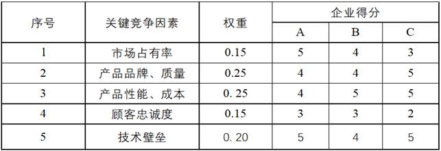 (2)根据每个因素在该行业中成功经营的重要程度,确定每个因素的权重,从0(最不重要)到1(最重要),权重和为1。同一因素在不同行业的权重可能是不同的,反映了该指标对不同行业竞争成功的重要性不同。