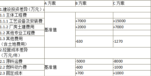 <5>、B方案和C方案的建设投资差额=116800-100000=16800万元,建设期每年投入8400万元,两个方案的差额项目投资财务净现值