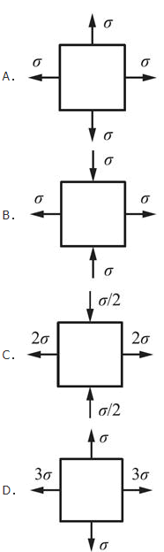 单选题 在图示4种应力状态中,最大切应力τmax数值最大的应力状态是( )。