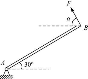 手柄AB长25cm,质量为60kg。在柄端B处作用大小为40N的力F,如图所示。当α角从零逐渐增大至60°时,其角加速度