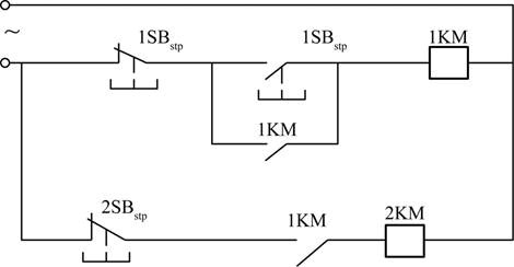 设电动机M1和M2协同工作,其中,电动机M1通过接触器1KM控制,电动机M2通过接触器2KM控制,如果采用图示控制电路方