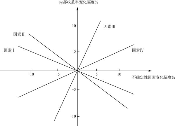 下图是某项目通过不确定性分析得出的结果,图中各条直线斜率的含义为各影响因素对内部收益率的( )。