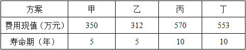 现有甲、乙、丙、丁四个互斥的项目方案,各方案预计的投资额和年经营成本各不相同,但预计销售收入相同,有关数据见下表,基准收益率为10%,则应选择( )。[已知(P/A,10%,5)=3.7908,(P/A,10%,10)=6.1446]