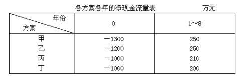 某项目有甲乙丙丁4个投资方案,寿命期都是8年,基准折现率10%,(P/A,10%,8)=5.335,各年的净现金流量如下