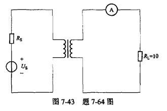 单项选择题 在信号源(us,Rs)和电阻RL,之间插入一个理想变压器,如图7-43所示,若电压表和电流表的读数分别为100V和2A,则信号源供出电流的有效值为()A。
