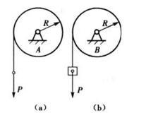 单选题 在两个半径及质量均相同的均质滑轮A及B上,各绕一不计质量的绳,如图所示,轮B绳末端挂一重量为P的重物;轮A绳末端