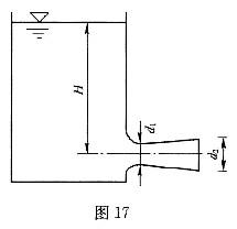 水箱中的水经一扩散短管流到大气中,如图17所示。直径d1=100mm,该处绝对压强p1=0.5大气压,直径d2=150m