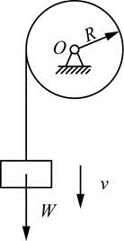 如图均质圆轮,质量m,半径R,由挂在绳上的重为W的物块使其绕质心轴O转动。设重物的速度为v,不计绳重,则系统动量、动能的