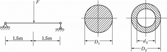 如图所示,简支梁中点承受集中力F,若分别采用图示面积相等的实心和空心圆截面,且空心圆截面的d2/D2=3/5,则两者最大