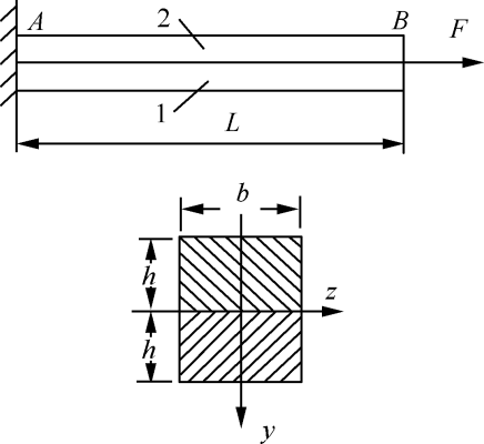 两根杆粘合在一起,截面尺寸如图所示。杆1的弹性模量为E1,杆2的弹性模量为E2,且E1=2E2。若轴向力F作用在截面形心,则杆件发生的变形是( )。