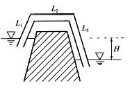 两水池用虹吸管连接,管路如图所示。已知上下游水池的水位差H为2m,管长L1为3m,L2为5m,L3为4m,管径为100mm,沿程阻力系数为0.026,进口阻力系数为0.5,弯头阻力系数为1.5,出口阻力系数为1.0。求通过虹吸管的流量,并说明在上下游水位差不变的条件下,哪些措施可以提高虹吸管的流量?