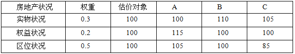 可比实例A的房地产状况调整系数=100/(100×0.3+115×0.2+105×0.5)=100/105.5;