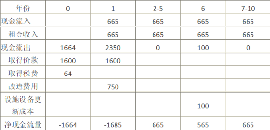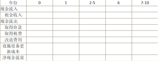 案例题 甲住房租赁企业以3200万元取得一幢建筑面积为2.5万平方米写字楼的经营权,取得税费率2%。取得价款分别在第1、2年初各支付50%,取得税费在第1年初一次性支付。经写字楼业主同意和有关部门批准,甲住房租赁企业拟将该写字楼改造为长租公寓,改造期为1年,改造成本300元/m2、在改造完工时一次性支付,改造完工后即可出租经营。长租公寓的可出租面积为2万平方米,年平均租金500元/m2,出租率95%,运营费用为租金收入的30%,运营收支均发生在年初。长租公寓每使用满5年需对设备设施进行更新,更新费用为100万元、更新时一次性支出,更新期间长租公寓正常出租。长租公寓的运营出租期为10年,目标收益率6%。请完成下列现金流量表,并计算该投资项目的财务净现值。