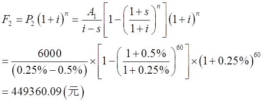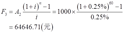 已知:i=3%/12=0.25%,n=5×12=60,s=0.5%,A1=12000×50%=6000(元),A2=1000元。