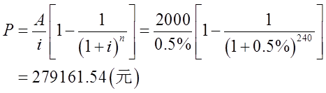 已知A=2000元,n=240,i=6%/12=0.5%,R=9.6%。