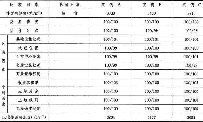 (6)假设这三个可比实例都是出让,在进行比较分析前,应对这三个可比实例的出让年限进行修正,统一调整为法定出让年限状况下楼面地价,再进行市场法的分析计算。
