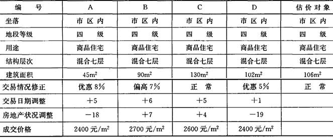 不定项选择题 某商品房交易估价,评估人员采用市场比较法估价,收集了四个近期交易成交的实例资料如表3-2。 表3-2 可比