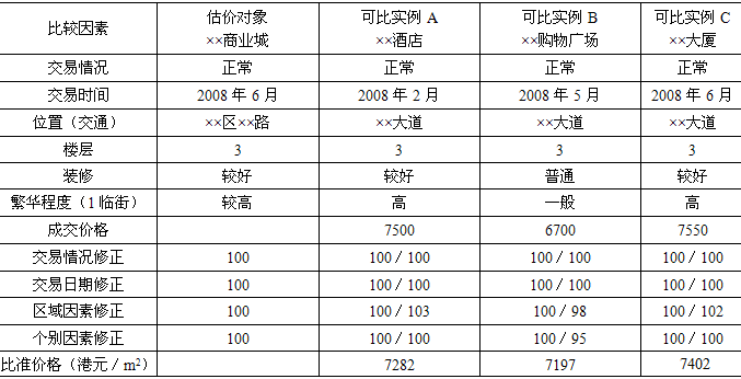 (4)区域因素修正中,可比实例A的描述性语言:“估价对象所处的××商业城的区域;条件略优于可比实例”,与表格中的繁华程度(高)、修正系数为100/103并不符合,“可比实例A所处的区域条件略优于估价对象所处的××商业城”,故作减价调整。