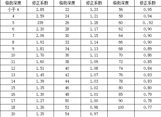 表10-5某城市商业用地临街深度(基准深度为50米)修正系数表