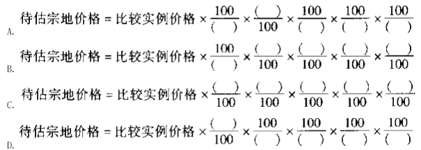 单选题 采用市场比较法评估地价时,除交易期日修正外,其他各项修正均以待估宗地为基准修正时,应采用公式( )。