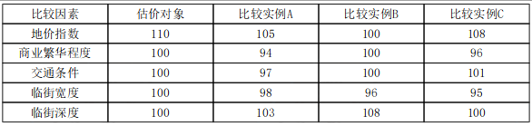 根据已得到的各比较因素条件指数,计算各比较因素的地价修正系数如下表: