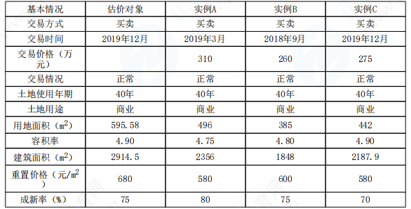 估价人员对收集的多宗交易实例进行比较分析后,选择了三宗交易实例作为比较实例,基本情况见下表: