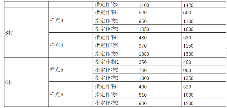 不定项选择题 某县只有三个行政村,通过查询《农用地质量分等规程》(GB/T28407—2012)可知,该县的标准耕作制度是一年三熟,指定作物分别为指定作物1、指定作物2和指定作物3,对应的产量比系数是指定作物1为1.000,指定作物2为0.685,指定作物3为0.594。对每个行政村选择两个样点进行指定作物产量调查,数据如表1所示。
