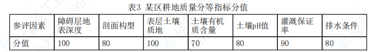 根据资料可知,某评价单元为水田,其参评因素按照《农用地质量分等规程》(GB/T28407-2012)附录表C.18和附录表C.19的标准赋予不同参评因素的分值,如表3所示。