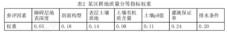 通过查询附录表B.1、表B.2和表C.21可以得到该区的标准耕作制度是“甘薯—早稻—晚稻、春花生—秋甘薯”,耕地质量分等指标体系及权重,如表2所示。