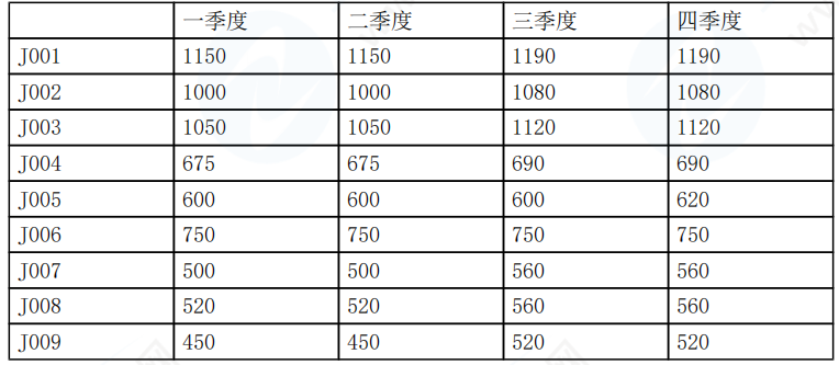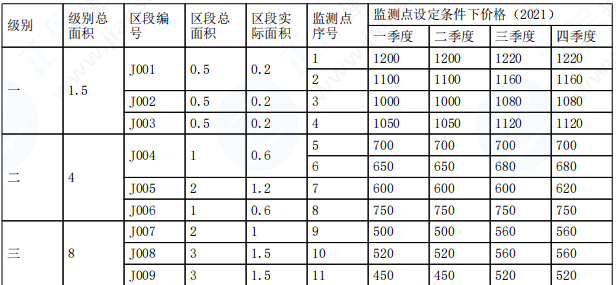 J001第一季度的地价水平值计算如下:(1200+1100)/2=1150(元/平方米)。