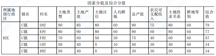 不定项选择题 2020年,由A市统一部署,B区结合技术方案和实际情况,以本区村级行政区域为基本单元,采用多因素综合评价法划分征地区片,选择土地类型、土地产值、土地区位、人均耕地、总产值、农民可支配收入、土地供求关系、耕地等级作为影响征地补偿标准的主要因素。该区C镇各村的因素分值及综合分值如下表所示。