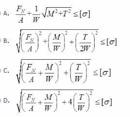单选题 图示圆轴截面积为A,抗弯截面系数为W,若同时受到扭矩T、弯矩M和轴向力FN的作用,按第三强度理论,下面的强度条件表达式中正确的是( )。