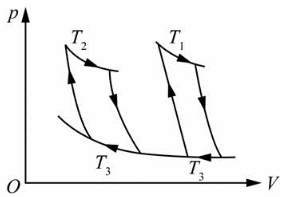 两个卡诺热机的循环曲线如图所示,一个工作在温度为T1与T3的两个热源之间,另一个工作在温度为T2和T3的两个热源之间,已