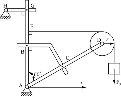 图示构架,G、B、C、D处为光滑铰链,杆及滑轮自重不计。已知悬挂物体重FP,且AB=AC。则B处约束力的作用线与x轴正向
