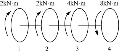 等截面圆轴上装有4个皮带轮,每个轮传递力偶矩如图,为提高承载能力,方案最合理的是( )。