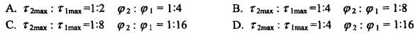 单项选择题 受扭实心等直圆轴,当直径增大一倍时,其最大切应力τ2max和两端相对扭转角 φ2与原来的τ1max和 φ1的比值为( )。