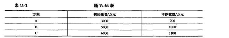 单项选择题 现有三个独立方案A、B、C,寿命期均为10年,现金流量如表11-2所示,已知 基准收益率为8%, (P/A,