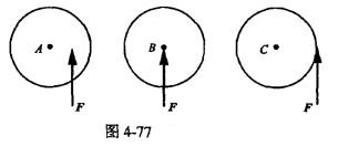 单项选择题 如图4-77所示三个质量、半径相同的圆盘A、B和C,放在光滑的水平面上;同样大小和同方向的力F分别作用于三个