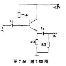 单项选择题 共集电极放大电路如图7-56所示。已知:β=50,UBE=O.7V,当输入正弦电压有效值Ui=7.5mV,输出电压有效值U0最接近于()。
