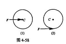 单项选择题 两质量、半径相同的圆盘,放在光滑水平面上,由静止开始同时受同样的力f作用,但作用点不同,如图4-58所示,则
