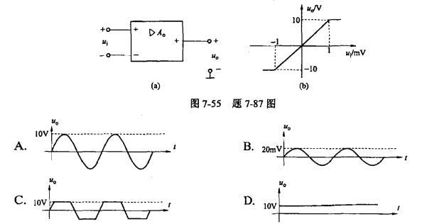 单项选择题 图7-55(a)所示运算放大器的输出与输入之间的关系如图7-55(b)所示,若Ui=2sinωtV,则u0为()。