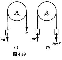 单项选择题 如图4-59所示(1)、(2)系统中的均质圆盘质量、半径均相同,角速度与角加速度分别为ω1、ω2和α1、α2,则有( )。