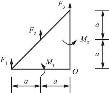在图示平面力系(图)中,已知:力F1=F2=F3=10N,a=1m,力偶的转向如图所示,力偶矩的大小为M1=M2=10N