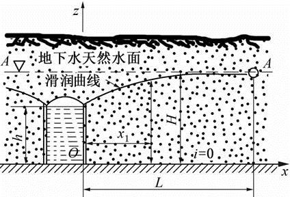 在水平不透水层上修建有一条长l=1000m的集水廊道,如图所示。已知含水层的厚度H=8.0m,排水后,廊道内水深降至为h