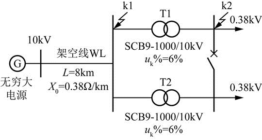 图示为某无穷大电力系统,SB=100MVA,两台变压器并联运行下k2点的三相短路电流的标幺值为( )。