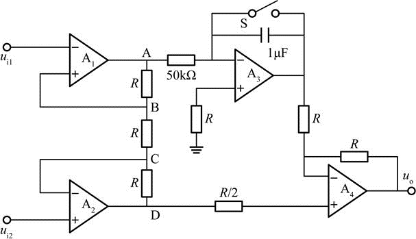 在图示电路中,已知ui1=4V,ui2=1V,当开关S闭合时,A、B、C、D和uo的电位分别是( )。