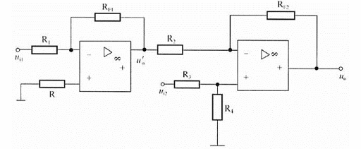 图所示电路,若RF1=R1,RF2=R2,R3=R4,则ui1、ui2的关系是( )。