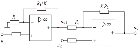 图示电路是利用两个运算放大器组成的具有较高输入电阻的差分放大电路,试求出与ui1、ui2的运算关系是( )。