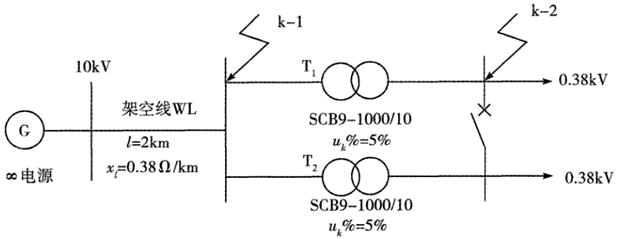 某无穷大电力系统如图所示,SB=100MWA,两台变压器分列运行下点k-1点的三相短路电流的标幺值为( )。